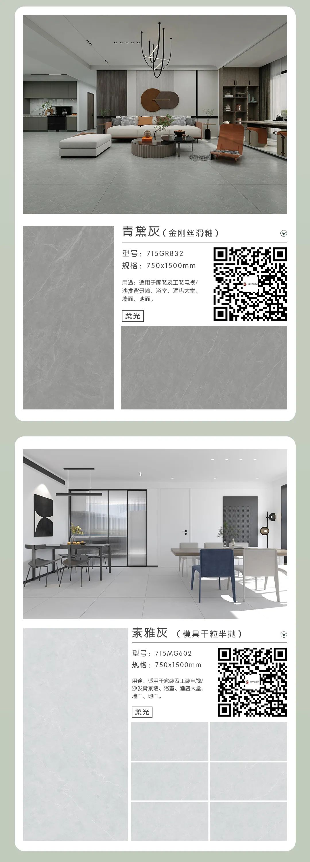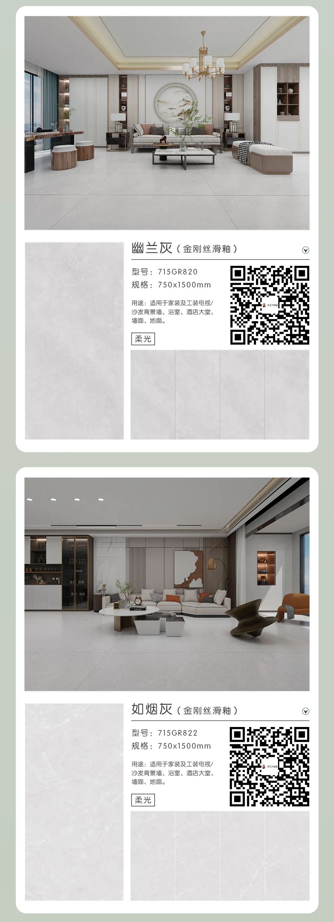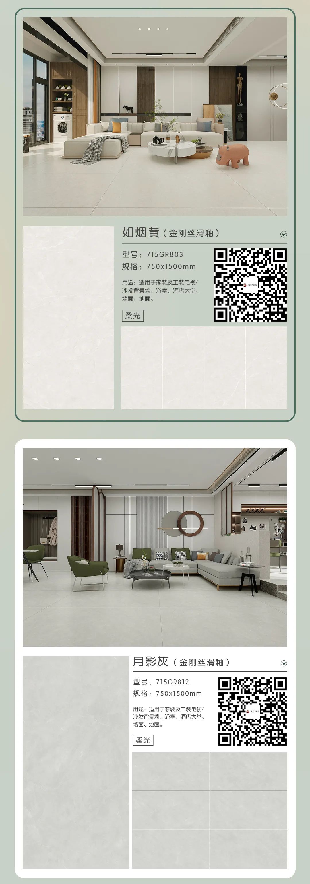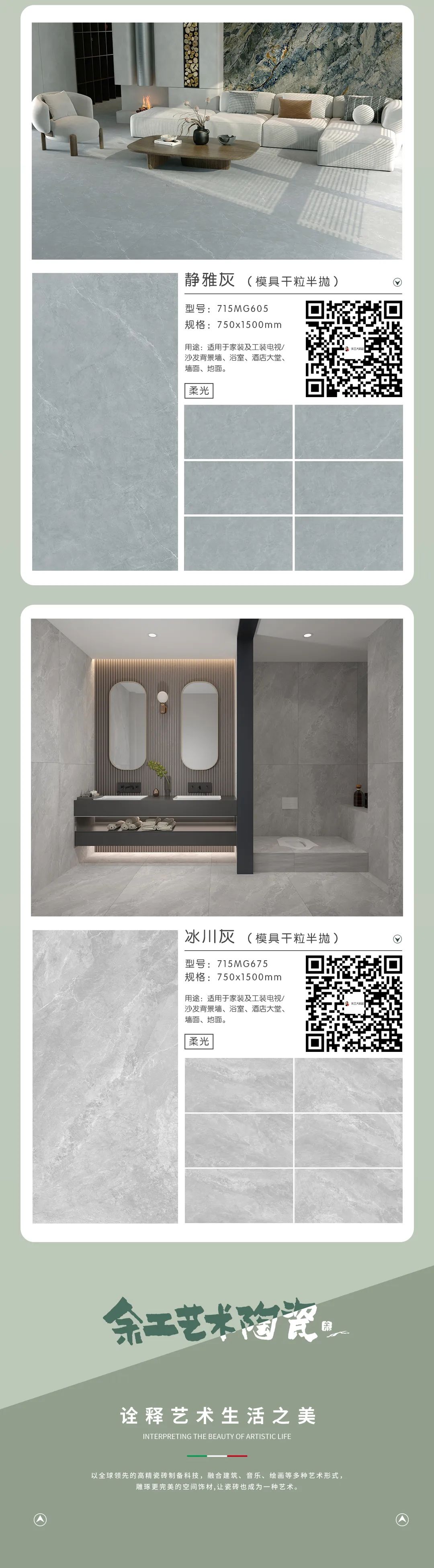 余工藝術(shù)陶瓷兩款柔光磚系列新品上市了,分別是素顏悅色與金鉆綢系列,如果您的裝修需要用到柔光磚,不妨來看看吧,瓷磚規(guī)格尺寸為:750*1500mm。